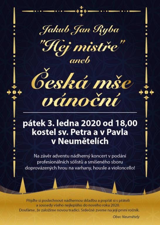 Kulturní výbor obce Neumětely vás všechny zve v pátek 3.1.2020 na Českou mši vánoční.