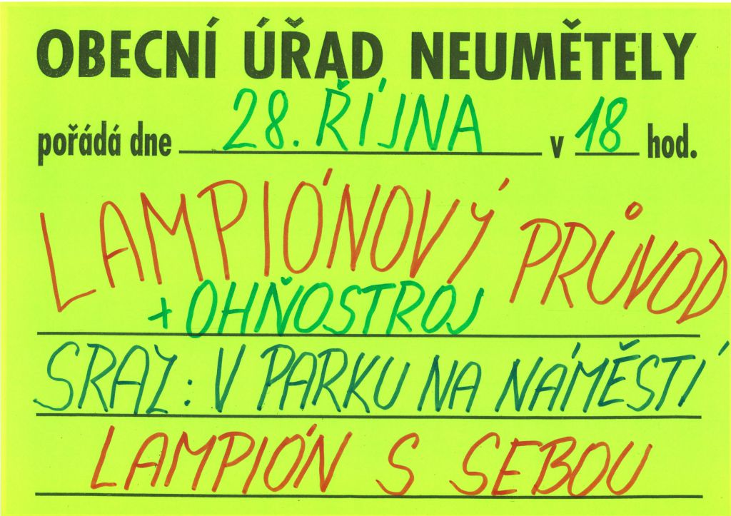 Letos se opět sejdeme v parčíku na návsi k Lampionovému průvodu. Průvod bude zakončen ohňostrojem !