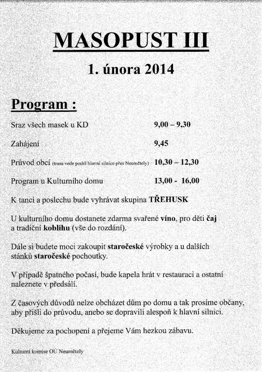 Zveme vás na již v pořadí třetí Masopust v Neumětelích !