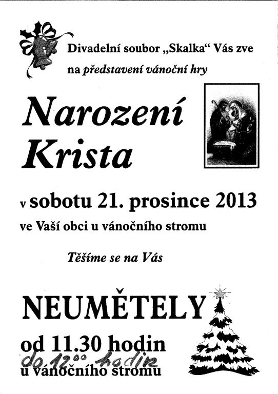Divadelní soubor "Skalka" Vás zve v sobotu 21.12.2013 od 11,30 do cca. 12,00 hodin na představení vánoční hry