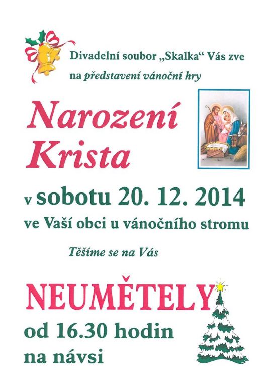 V sobotu dne 20.12.2014 od 16,30 hodin na návsi u vánočního stromu vás divadelní soubor Skalka zve na představení vánoční hry "Narození Krista".