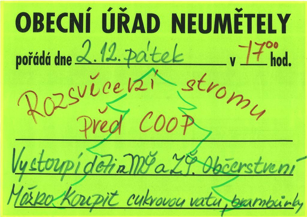 Sejdeme se nejen na rozsvícení stromu, ale hlavně si přijdeme poslechnout vystoupení našich dětí z MŠ a ZŠ Neumětely a popovídat si.