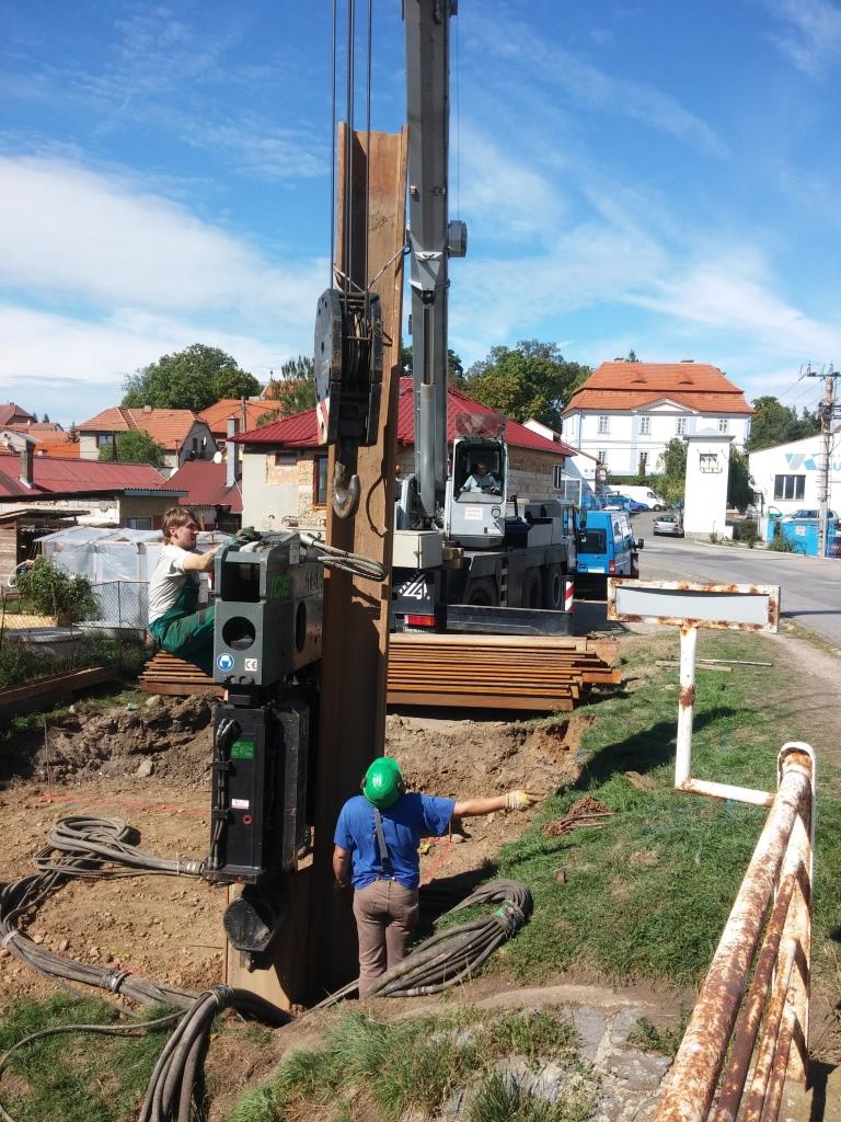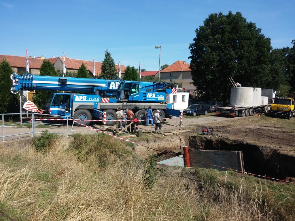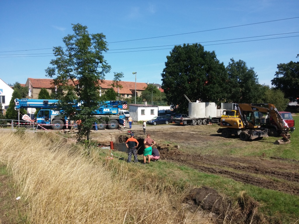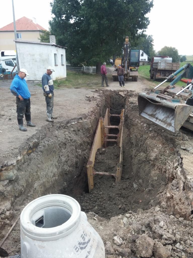 Dnes, tj. 16.9.2015 firma začala s přípravou protlaku pod okresní komunikací před mostkem ve směru na Hostomice. Je potřeba vyhloubit pracovní šachtu, ze které bude protlak prováděn. Vzhledem k tomu, že na místě byly obavy ze sesunů půdy, musela firma přistoupit k nadstandardnímu řešení vyztužení boků ocelovými vzpěrami - viz. část fotogalerie. Věříme, že další postup při výstavbě kanalizace již bude bez větších problémů.