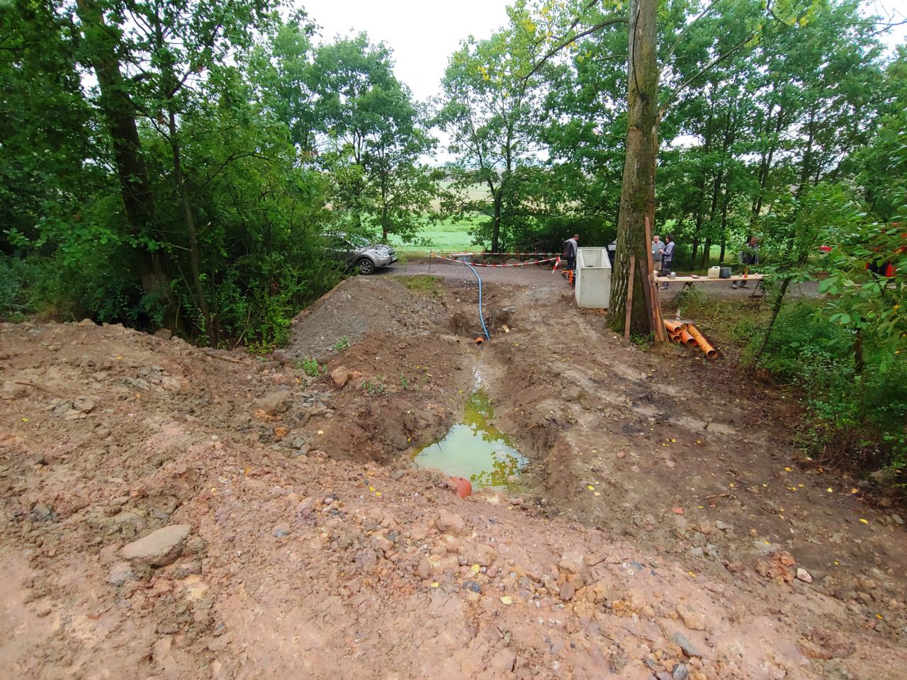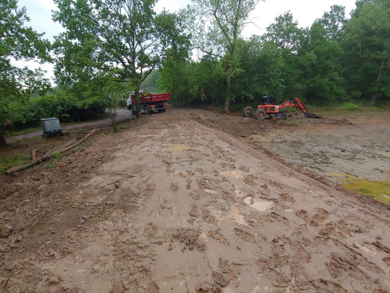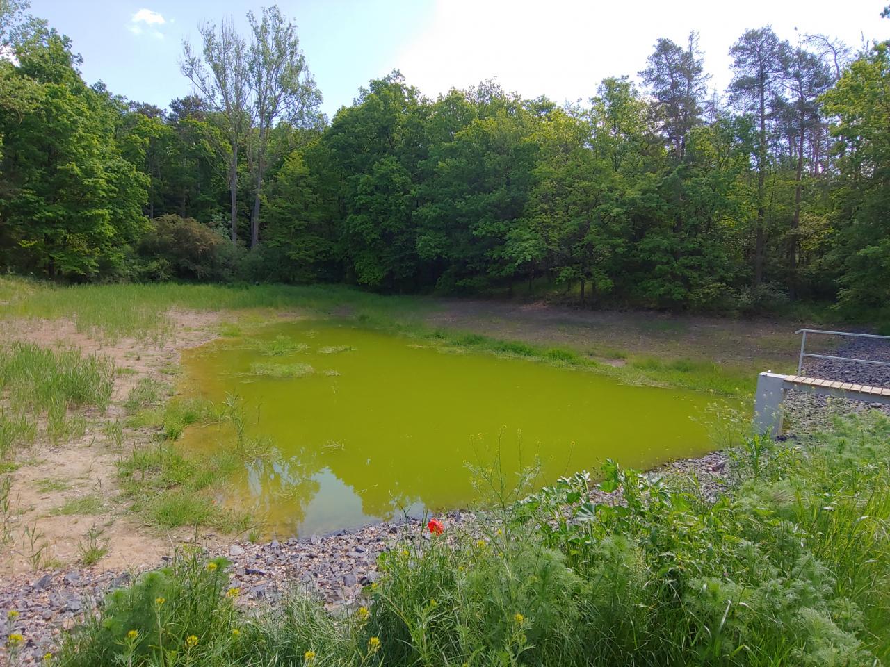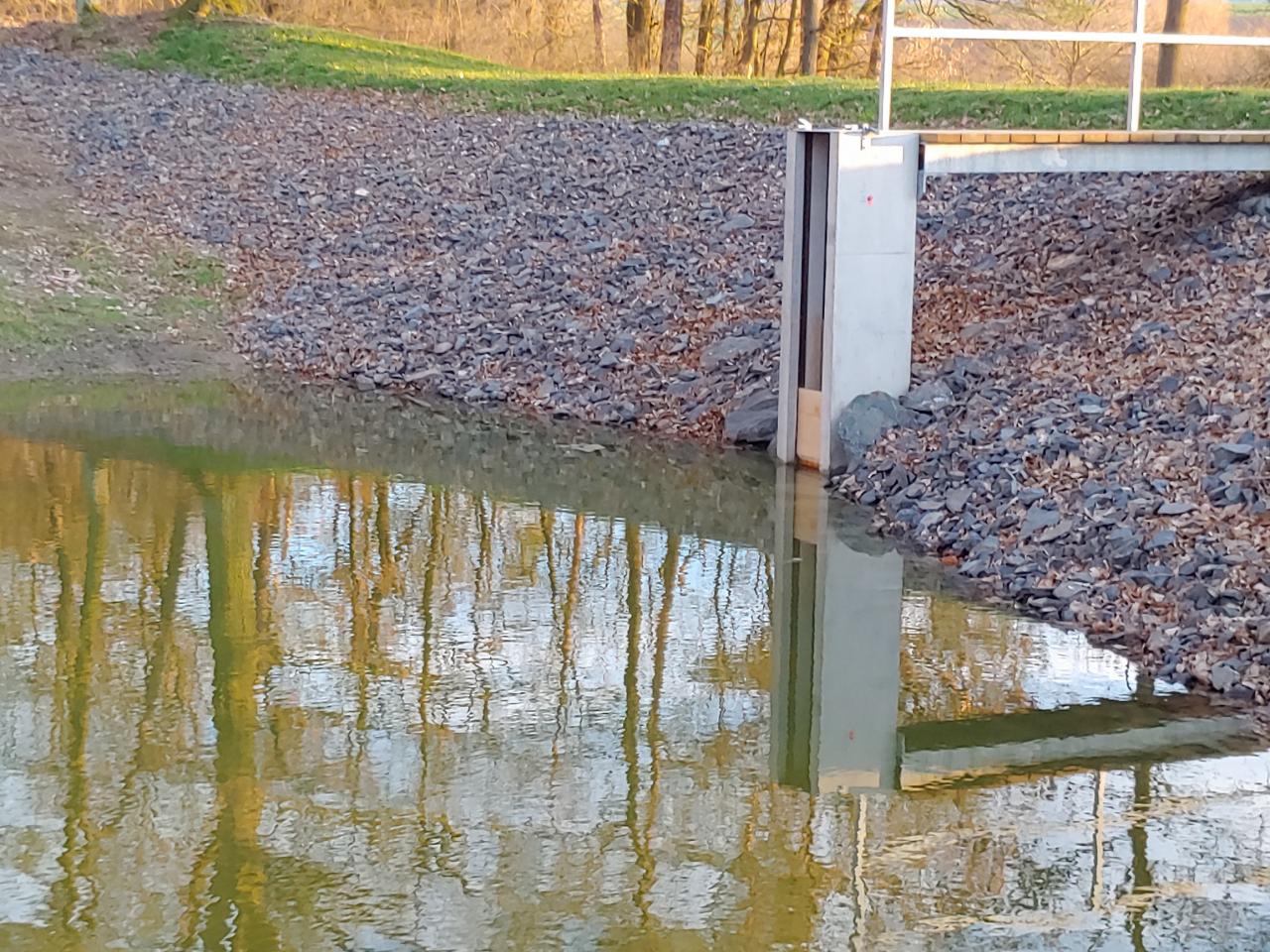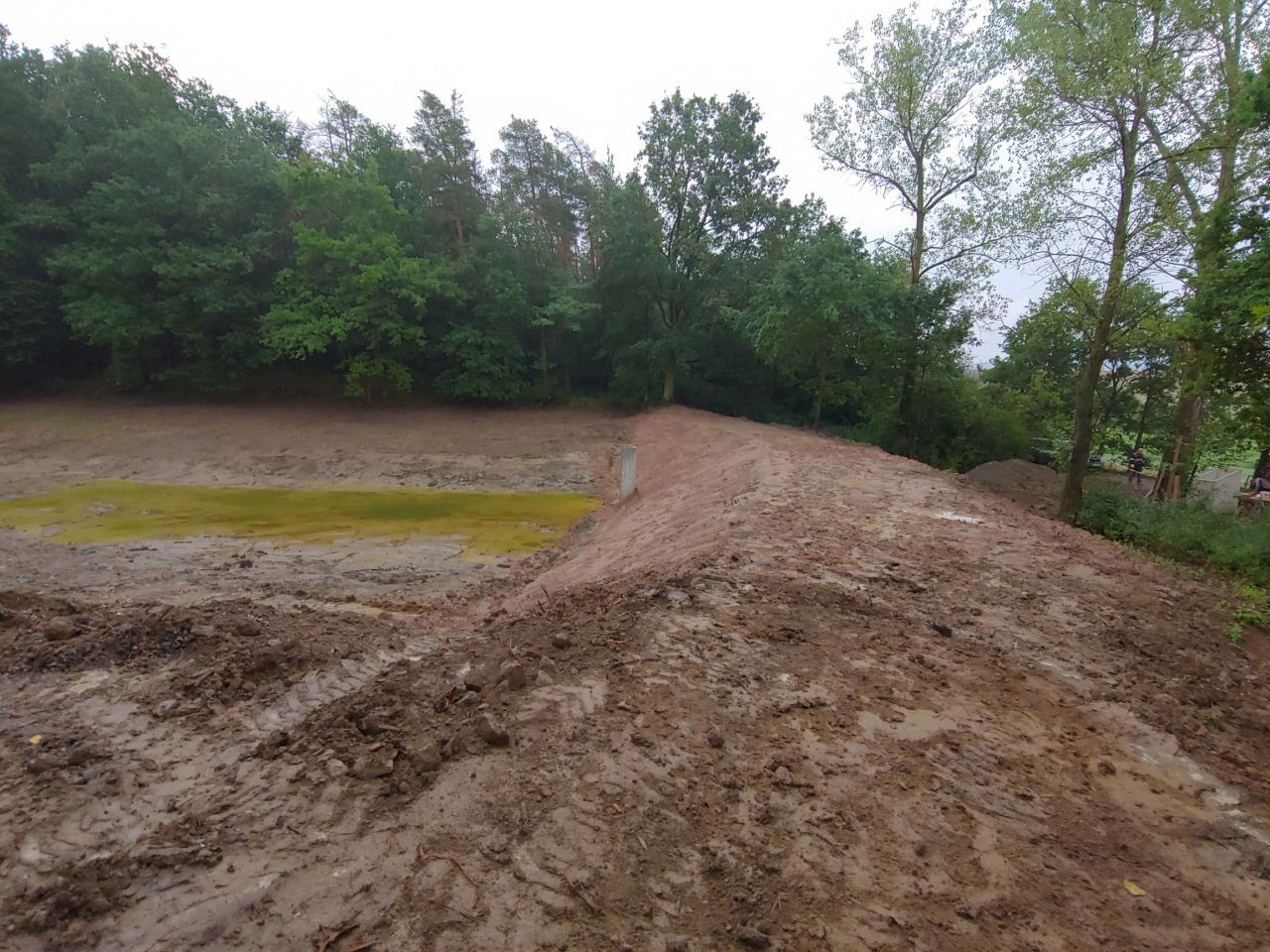 Květen 2021 byl chyrakteristický většími dešťovými srážkami. Ty se projevily i u lesního rybníčku. Vody z lesa rybníček zcela naplnily a dokonce došlo k přetečení. Díky dostatčně dimenzovanému přelivu nedošlo k poškození hráze samotné. Nicméně přebytečná voda, která byla směrována do horské vpusti, a následně do potoka, poničila číst žulové zídky - viz. fotografie. Po vyschnutí musíme vyřešit tuto drobnou opravu. Po poradě s projektantem díla i technickým dozorem jsme rádi, že nakonec nedošlo k větším škodám.