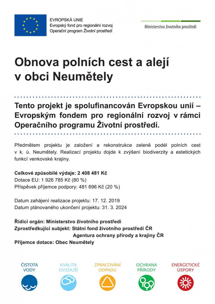 Získali jsme dotaci na podporu Obnovy polních cest a alejí v obci Neumětely (extravilánu) z programu 11531 - Operační program životní prostředí 2014-2020. V elektronickém veřejném výběru zvítězila společnost JIB, s.r.o, se kterou byla uzavřena smlouva o dílo. Cesty jsou již vytýčeny a staveniště je předáno. Očekáváme zahájení prací.