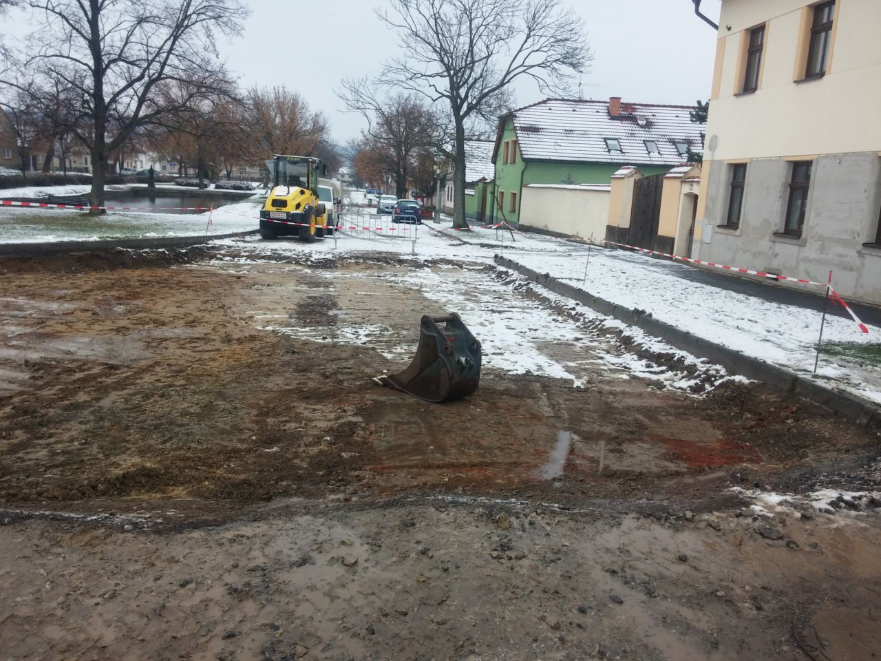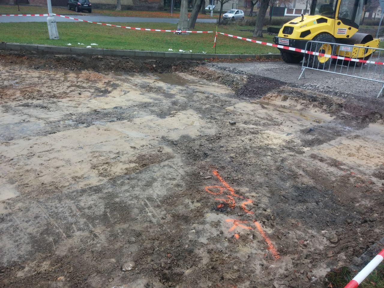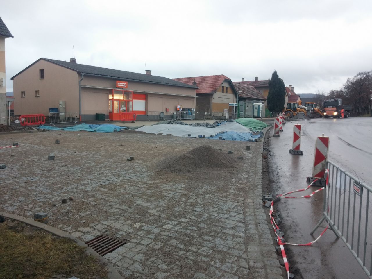 Vzhledem k tomu, že zde jední nákladní automobily, traktory a zásobuje se prodejna COOP, bylo nutno upravit i podloží. Proto jsme přistoupili ke stejné skladbě podkladu jako na první části náměstí. Situaci komplikovaly podzemní sítě, díky kterým musel být zvolen zvlášť opatrný způsob stavby.