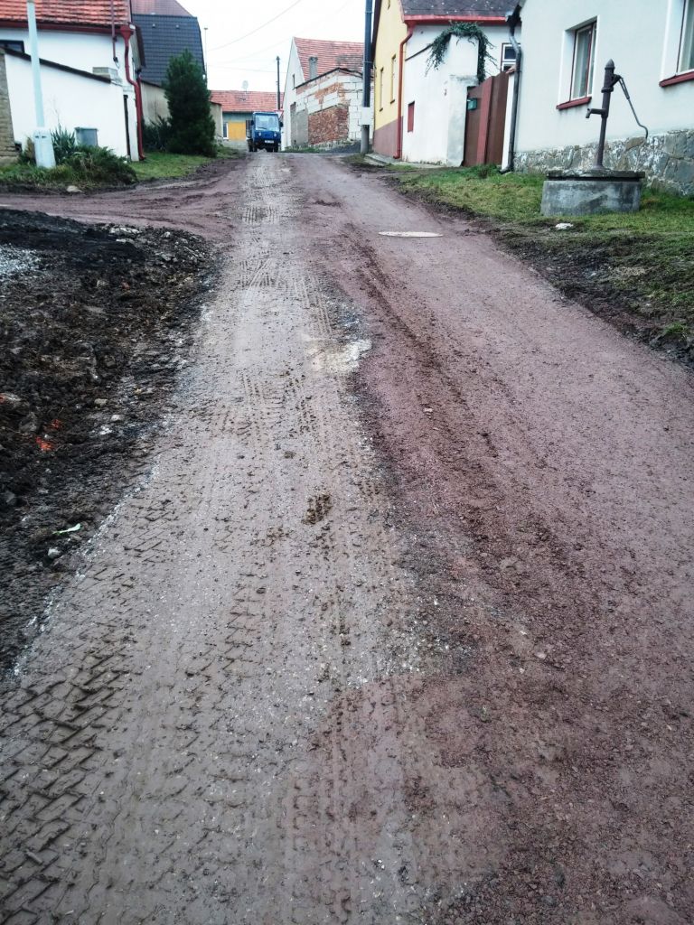 Vjezd do lokality z krajské komunikace v úseku u "staré školy" byl naprosto nevyhovující. Totéž platí o úseku mezi č.p. 79 až 86. Zde docházelo ke splavování štěrku a zanášení deštových vpustí. Příčné odtokové kanálky již dávno neplnily svou funkci. Zde došlo k vysvahování povrchu komunikace a přidání či opravě kanilazčních vpustí.