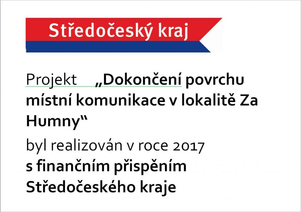 Akce "Dokončení povrchu místní komunikace a výstavba chodníků v lokalitě Za Humny" byla realizována za vydatné pomoci Středočeského kraje, kdy naše obec obdržela individuální účelovou dotaci z rozpočtu Středočeského kraje, a to ve výši 3.000.000,- Kč.